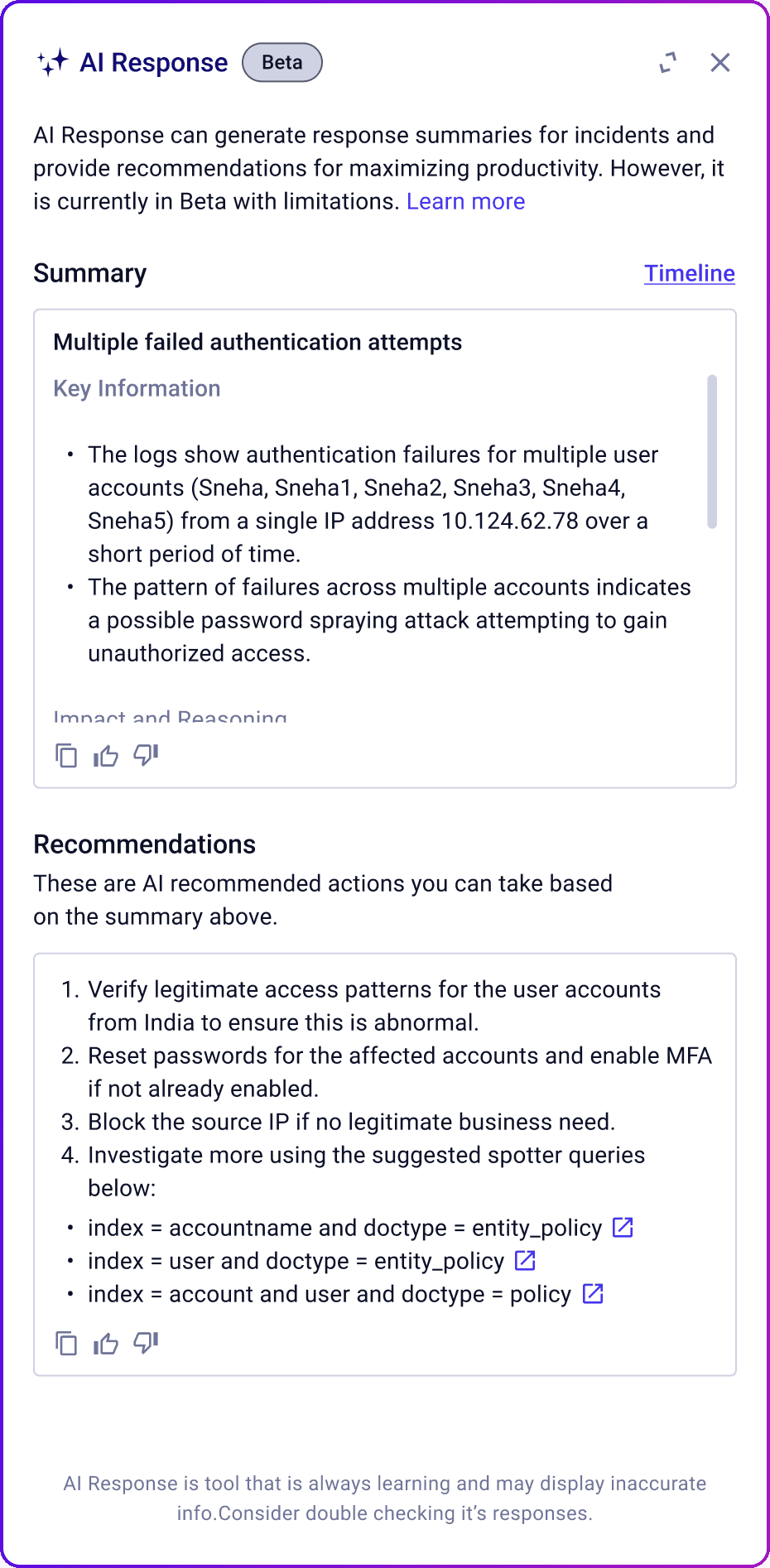 Al Response Summary is designed to support security analysts in effectively handling a high volume of alerts and meeting an organization's security requirements. Harnessing the capabilities of AI aims to save analysts valuable time by creating incident summaries and offering recommendations.